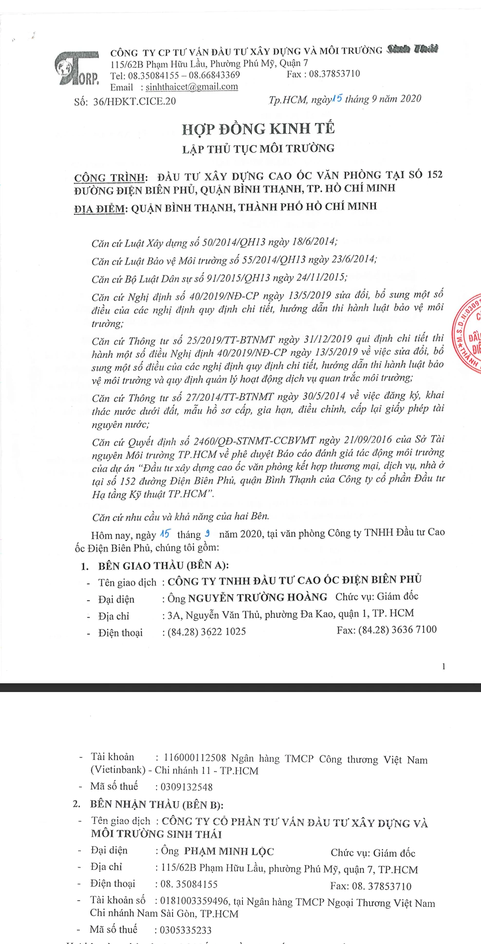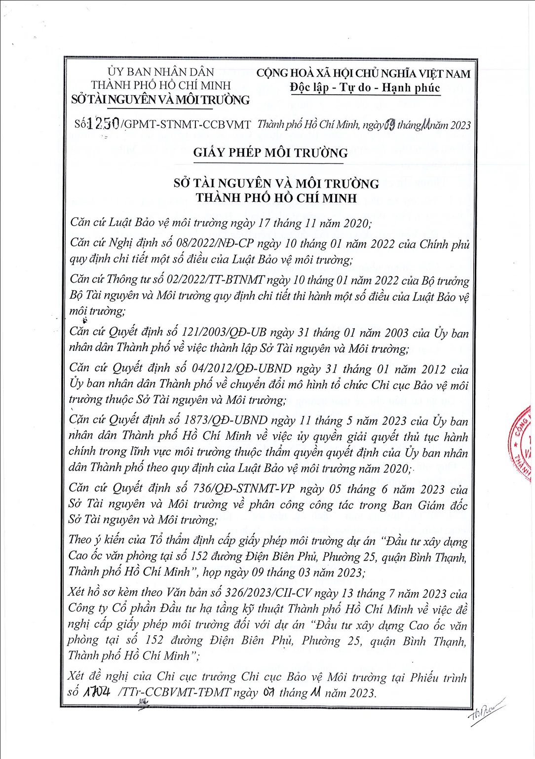 Thông báo kết quả của Sở Tài Nguyên và Môi Trường cho dự án Đầu Tư Xây Dựng Cao ốC Văn Phòng Tại Số 152 Đường Điện Biên Phủ, Quận Bình Thạnh, Tp. Hồ Chí Minh