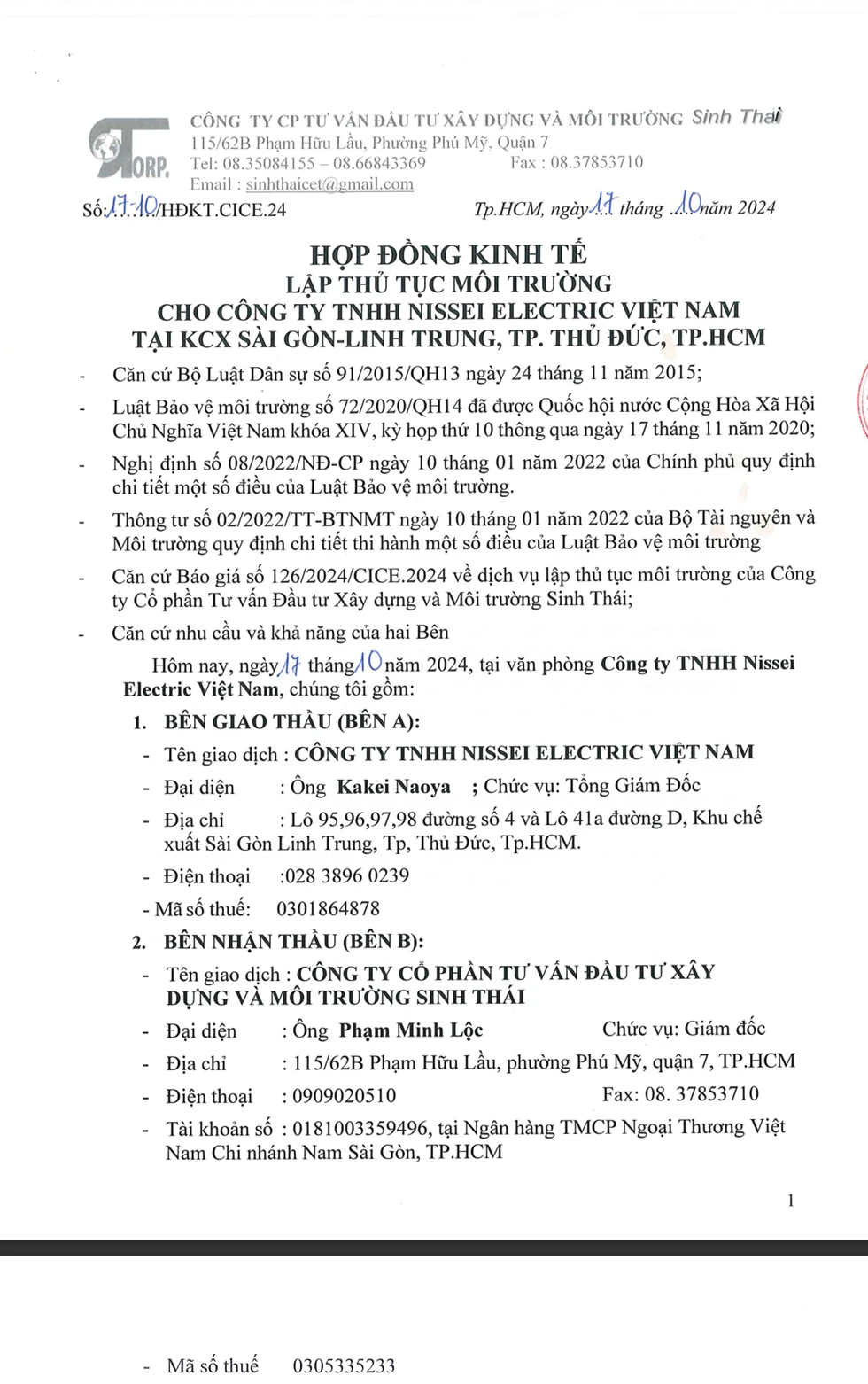 LẬP THỦ TỤC MÔI TRƯỜNG CHO CÔNG TY TNHH NISSEI ELECTRIC VIỆT NAM TẠI KCX SÀI GÒN-LINH TRUNG, TP. THỦ ĐỨC,TP. HCM