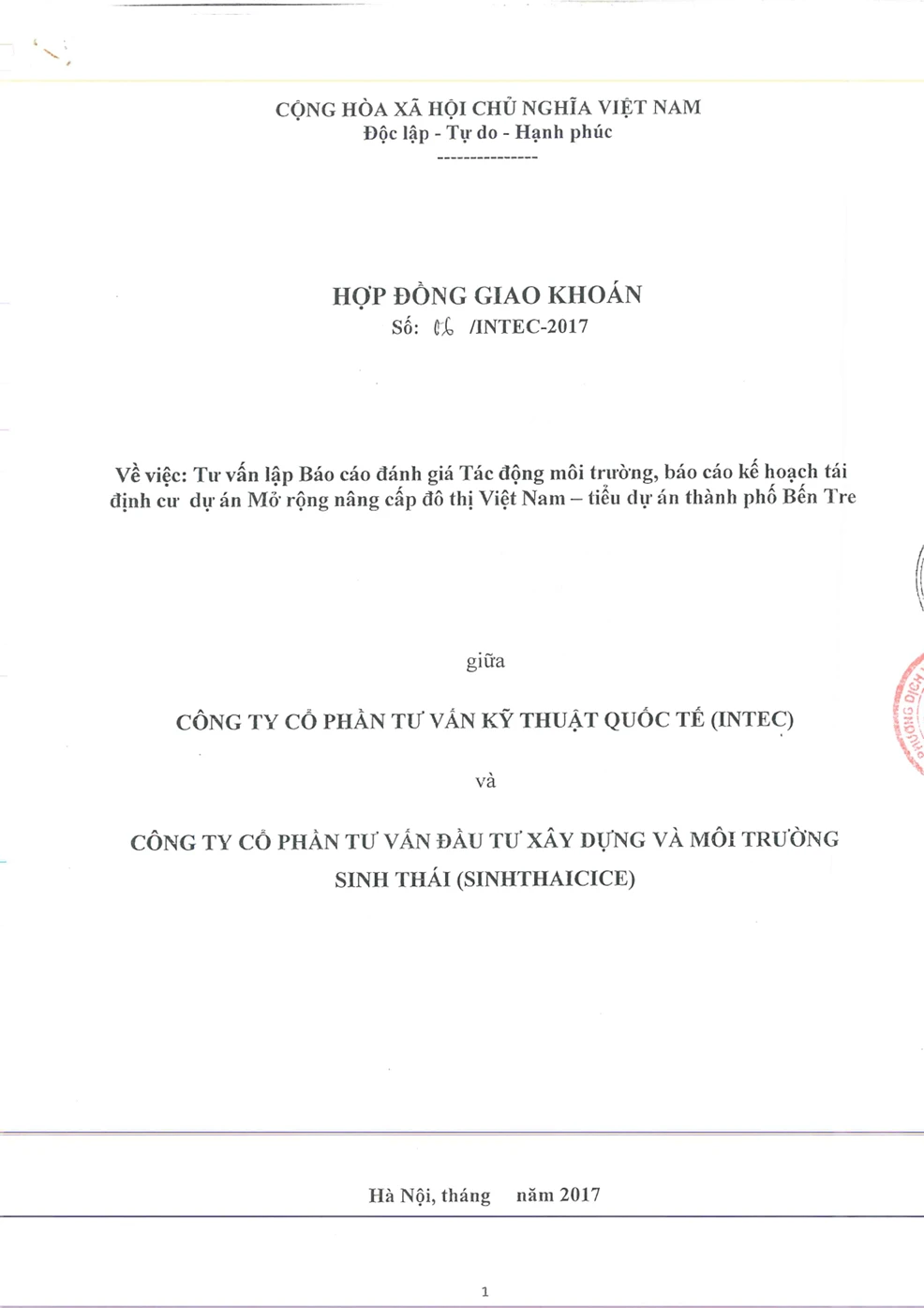 CONSULTING ON PREPARING ENVIRONMENTAL IMPACT ASSESSMENT REPORT, RESETTLEMENT PLAN REPORT FOR VIETNAM URBAN EXPANSION AND UPGRADING PROJECT - BEN TRE CITY SUBPROJECT