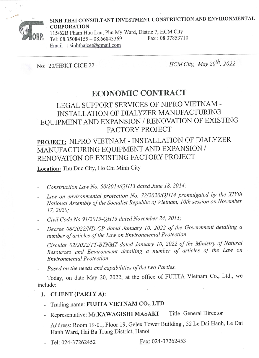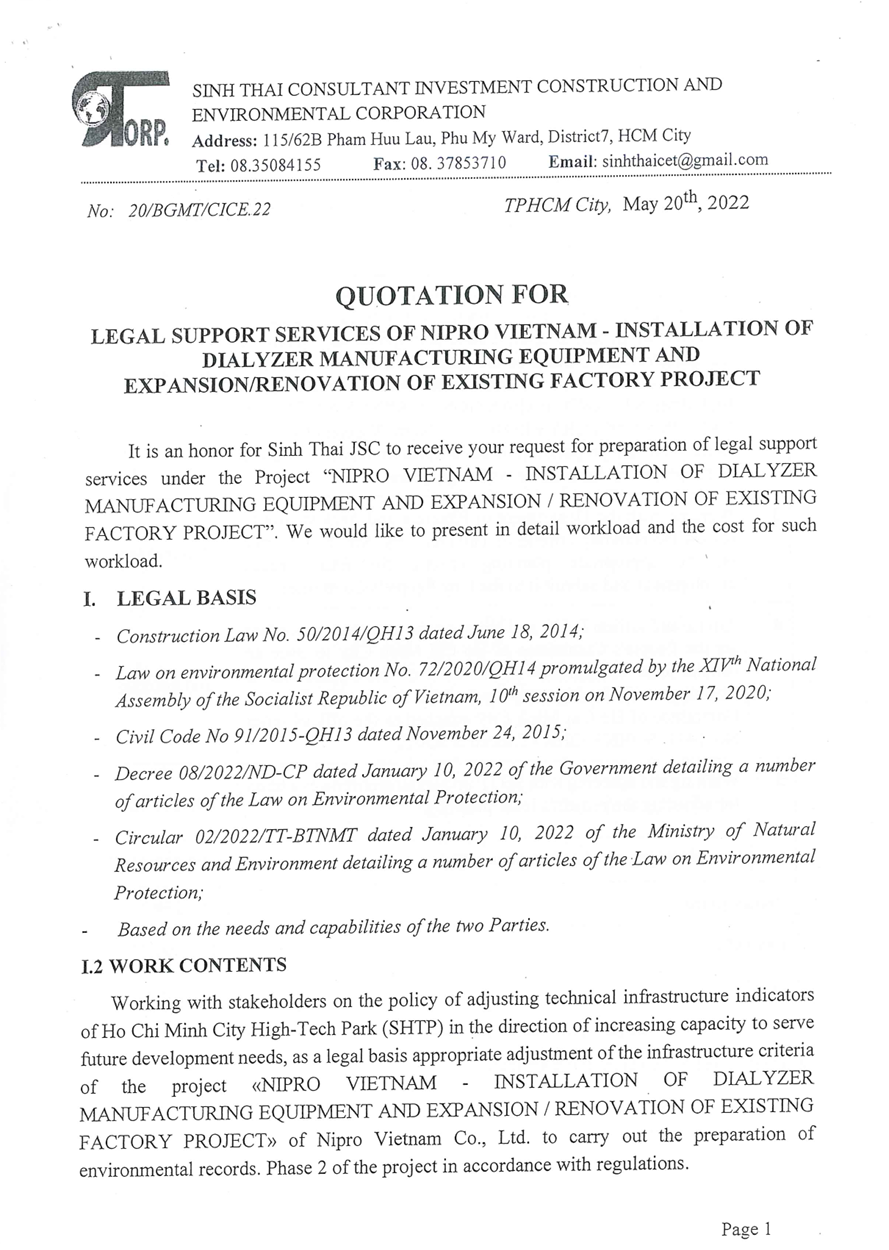 Legal Support Services Of Nipro Vietnam - Installation Of Dialyzer Manufacturing Equipment And Expansion/renovation Of Existing Factory Project