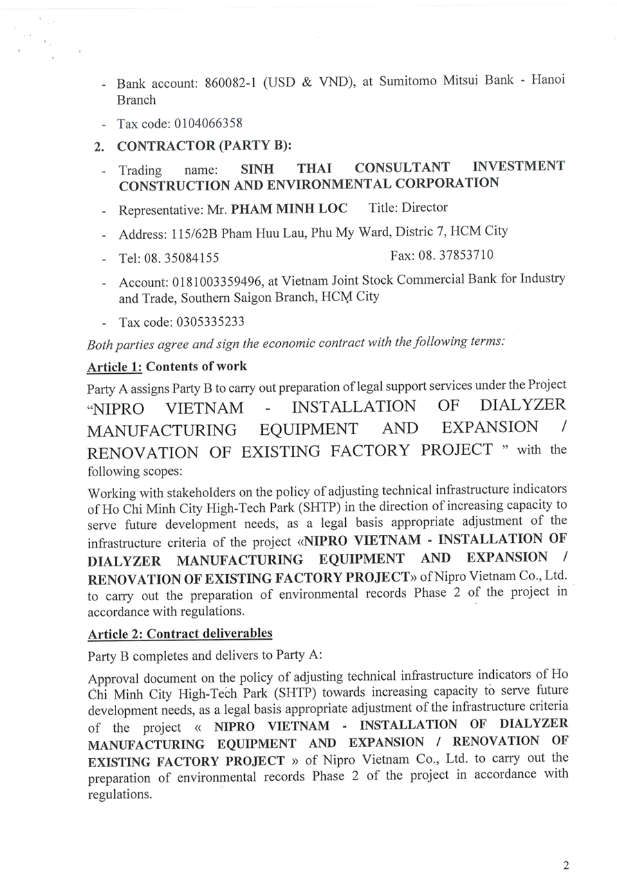 LEGAL SUPPORT SERVICES OF NIPRO VIETNAM - INSTALLATION OF DIALYZER MANUFACTURING EQUIPMENT AND EXPANSION/RENOVATION OF EXISTING FACTORY PROJECT